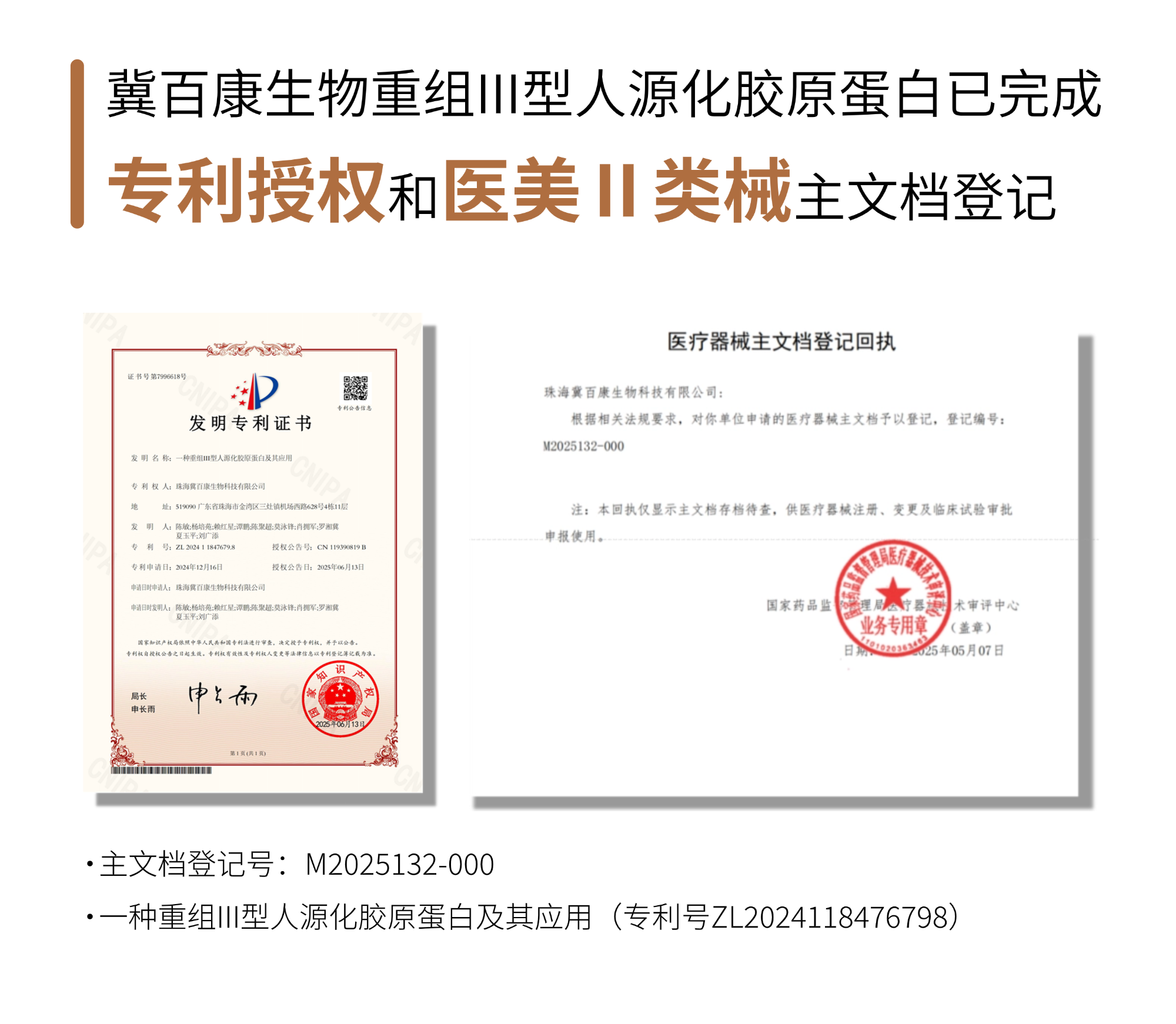 冀百康生物「重組III型人源化膠原蛋白」已獲專(zhuān)利并成功完成Ⅱ類(lèi)醫(yī)療器械主文檔登記